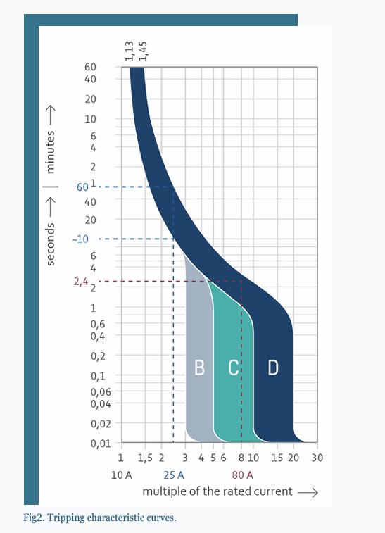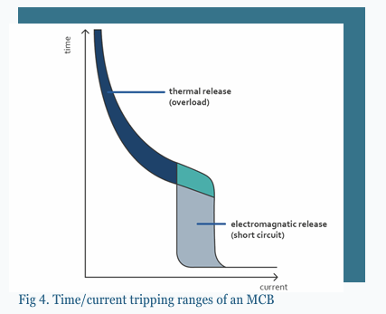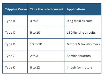 Tripping characteristic curves, issued by the manufacturer, illustrate the relationship between the current flowing through an MCB and the time taken for the breaker to trip. These curves ensure correct protection against both overcurrent and short-circuit conditions. MCBs to BS EN 60898-1 are classified according to their tripping characteristics, commonly known as B, C and D curves. General tripping characteristics for B and C curve MCBs can be found in BS 7671 Appendix 3. (D curves are not recognised for use in domestic applications.)