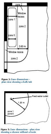 The zonal system The Regulations state: Horizontal or inclined ceilings, walls with or without windows, doors, floors and fixed partitions may be taken into account where these effectively limit the extent of locations containing a bath or shower as well as their zones. This is similar to current requirements in the 16th Edition except that the actual location containing the bath or shower is mentioned as well as the zones. The zones are similar to current Zone 1 has been extended from 0.6 m in the 16th Edition for showers without a basin for a fixed water outlet to a distance of 1.20 m from the centre point of the water outlet. Demountable shower heads are no longer mentioned. Zone 1 is now limited by the horizontal plane corresponding to the highest fixed shower head or water outlet or the horizontal plane lying 2.25 m above the finished floor level, whichever is higher. | |