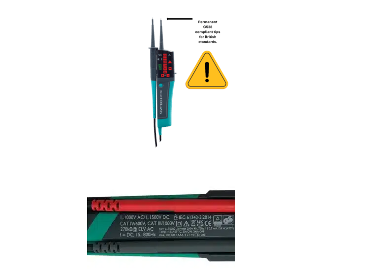 Furthermore, unlike some 2-pole testers, the KT5 does not need to detect a potential difference between probes to provide an indication of a dangerous voltage, it will detect a dangerous voltage with a single probe. Using a 2-pole tester that needs to see a potential difference between the probes will not detect a dangerous voltage where an earth, neutral or a separate phase is not present, but a single line voltage is present.