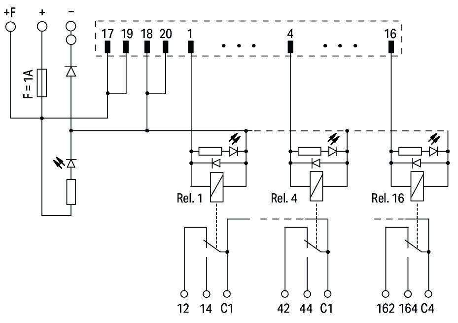 Interface module for system wiring; Pluggable connector per DIN 41651; Male connector; 20-pole; 16-channel relay output; 1 changeover contact; Triple-deck PCB terminal blocks; in mounting carrier